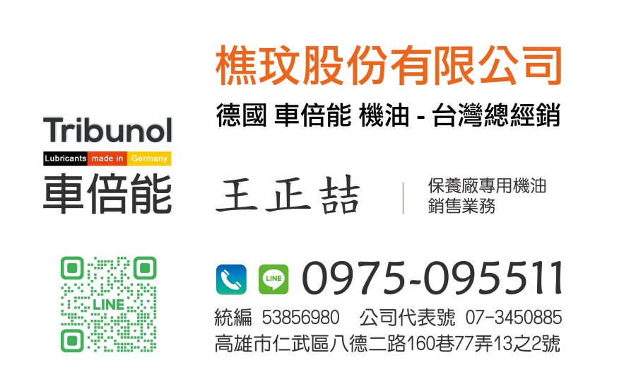 首頁聯絡我們 聯絡我們 王正喆 經理0975 095 511 葉佐堅 經理0910 300 331 德國車倍能機油台灣總代理倉庫地址:高雄市仁武區八德二路160巷77弄13之2號 Google Map導航 電子郵件:tribunol.tw@gmail.com 德國車倍能機油